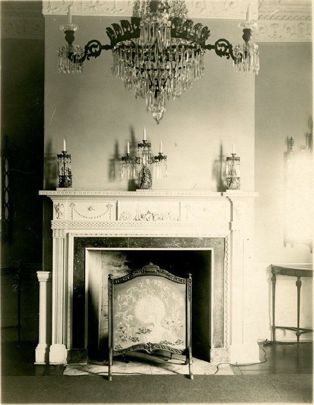 B&W photograph of a fireplace in an unidentified house. Chandelier also featured.Collection