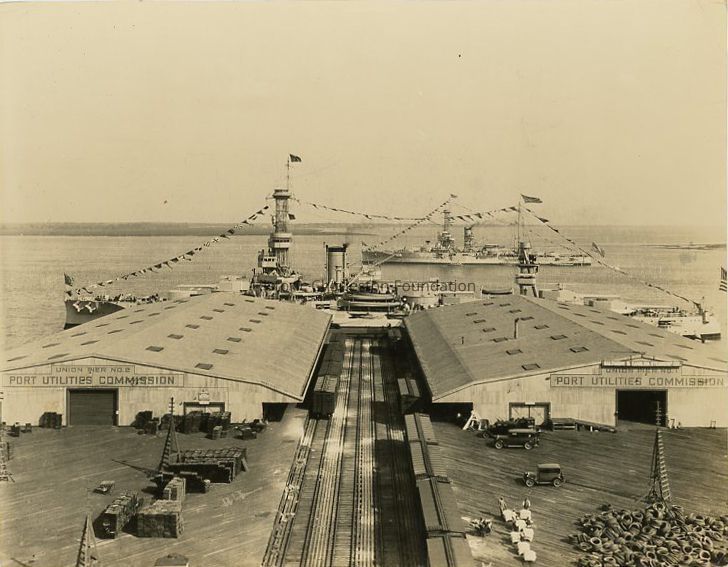 B&W photograph of Union Pier featuring a view looking east showing Utilities Commission Buildings No. 1 and No. 2 and two ships, one docked at the pier and one in the harbor. At right, dock workers pull goods toward Building No. 1, a few cars and a large pile of tires. At left are what appear to be stacks of bricks or blocks. Railroad tracks and trains are between the two buildings.
