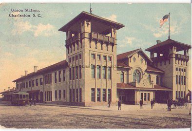 Lost Architecture, Postcards, Demolished buildings, lost buildings, Columbus Street, Union Station (Charleston, S.C.), Trolley cars, Carriages and coaches, Lost architecture--South Carolina--Charleston, Railroad stations--South Carolina--CharlestonPostcard Details