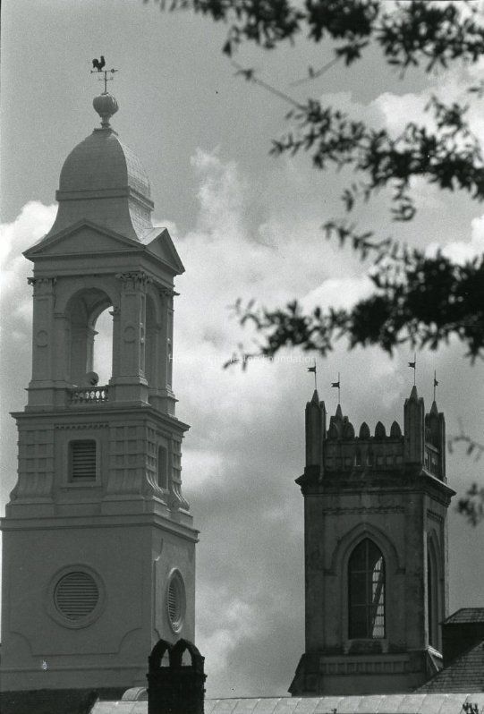 B&W photograph of the Unitarian Church steeple and the St. John's Lutheran Church steeple. (6 Archdale Street and 10 Archdale Street).Collection