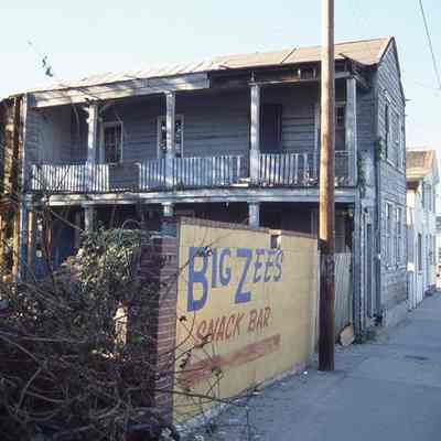 c: 491 Meeting Street and 493 Meeting Street. Directional sign for "Big Zees Snack Bar" painted on brick wall in foreground.