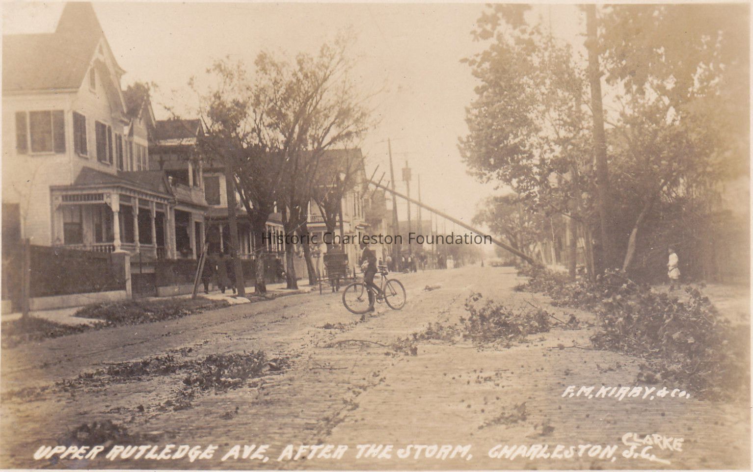 B&W photographic postcard of Upper Rutledge Avenue after the hurricane of 1911. Man on a bicycle surveys the scene.