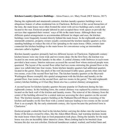 Tour booklet notes on the work yard, kitchen/laundry buildings and slave quarters, carriage houses/stables and slave quarters, urban slavey, "hiring out" and slave badges, and adaptive reuse. By Mary Fesak, HCF Intern, Summer 2017.