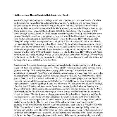 Various research reports and other materials related to urban slave dwellings in Charleston. Written by HCF Summer 2017 interns and others in preparation for HCF's new tour "Beyond the Big House" (9/16/2017). Includes the following:
