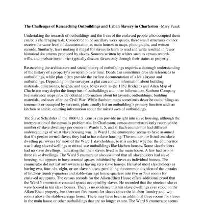 "Review of Charleston, SC Background Research, Secondary Sources for Slavery and Housing"