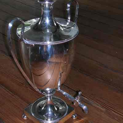 Neoclassical silver urn shape hot water urn by John Robins, London, 1787/88. On square base with four ball feet. Beading at base, barse of urn, and top of bowl. Lid with urn shaped finial. Front of bowl engraved with arms surmounted by engraved bird. Motto on ribbin beneath arms "ALTIUS TENDO." Teverse with engraved monogram "TCCK" under "ALTIUS TENDO" motto on ribbon and engraved bird. Reeded handles and spout. Fully hallmarked on underside of base and rim of lid. Kinloch family coat of arms.Collection