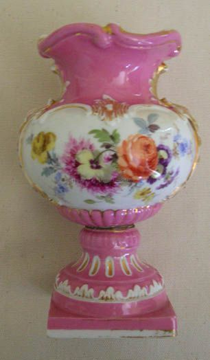 Flower vase, Continental, 19th century having undulating 'C'- scroll and gilt stringing oneverted lip over pinched neck and bulbous body, on circular pedestal base on rectangular plinth; molded leaf and bell drop handles both sides have white background, cartouche with floral decoration. Marked on underside with crossed swords and #40 all in blue, impressed 162, and 55178 or 33178Collection