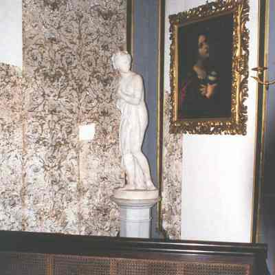 Statue sits on marble pedestal:
