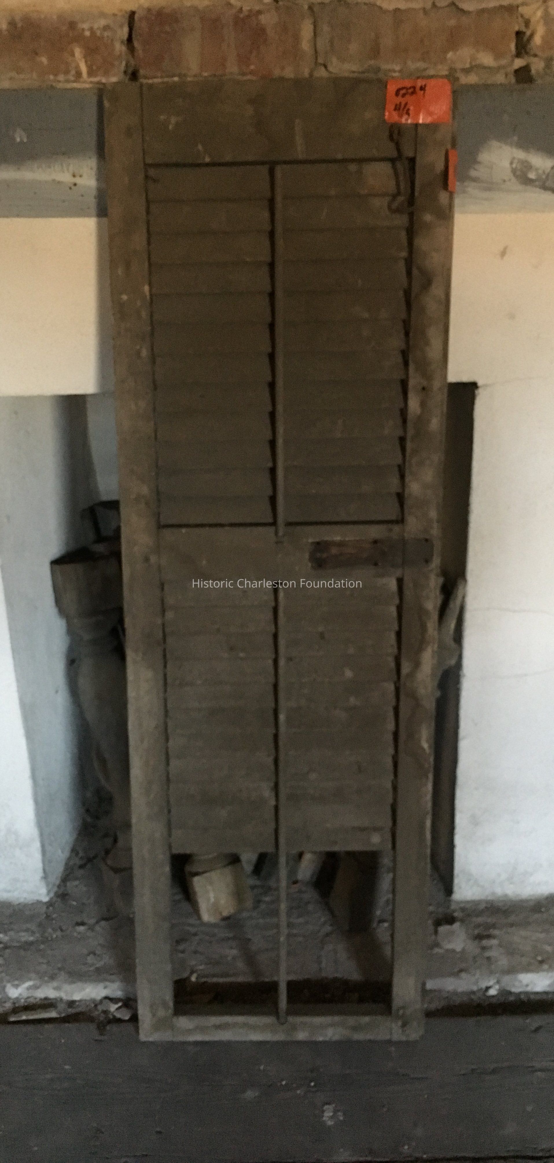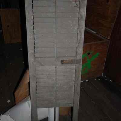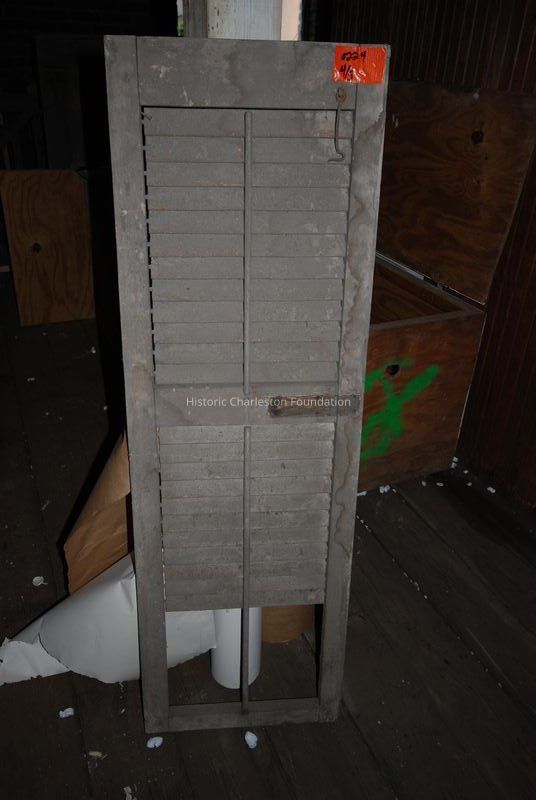 Shutter with moveable louvers and some hardware. Victorian, dated 1880-1910. Missing slats at bottom; most of paint gone.Collection