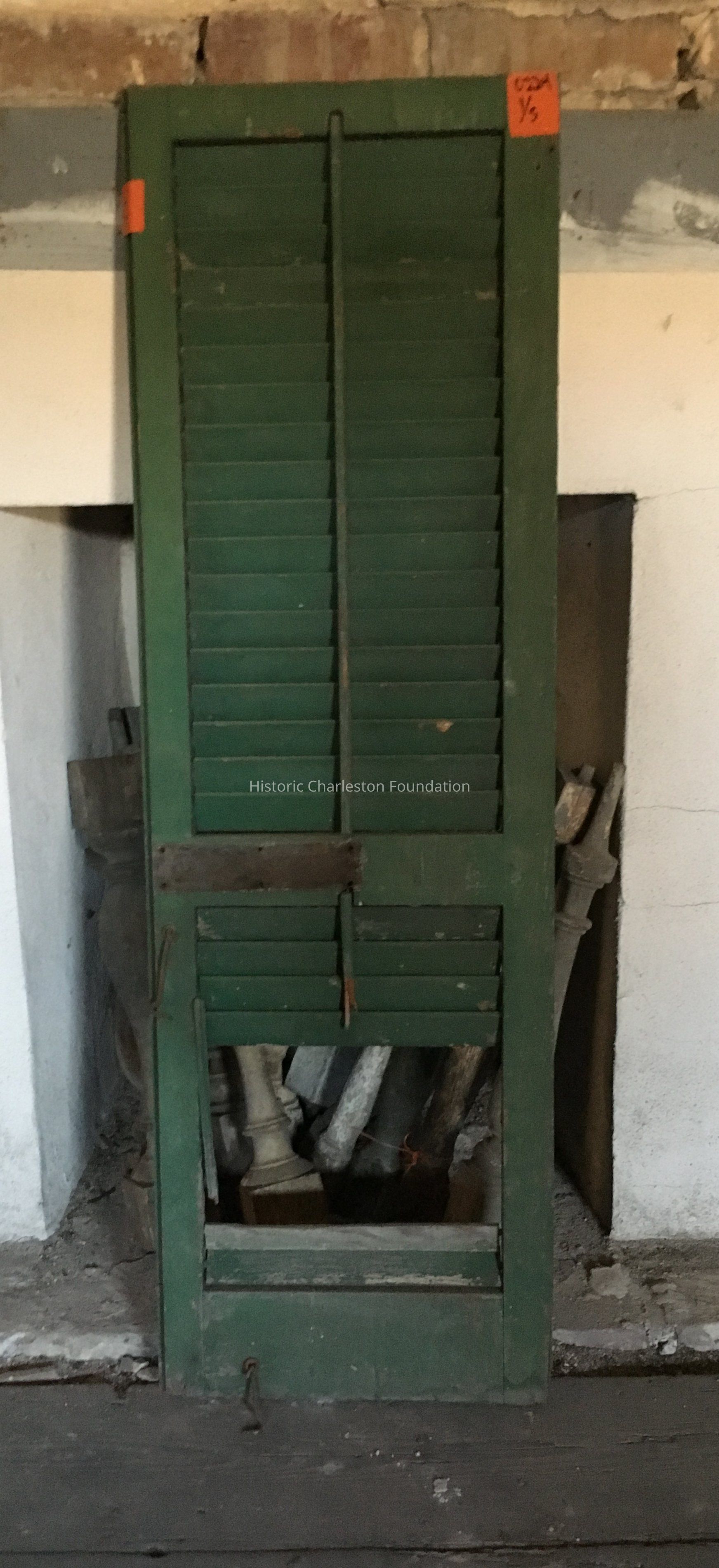 Shutter with moveable louvers and some hardware. Victorian, dated 1880-1910. Lower half of shutter missing slats; green paint apparent, slightly chipped.Collection