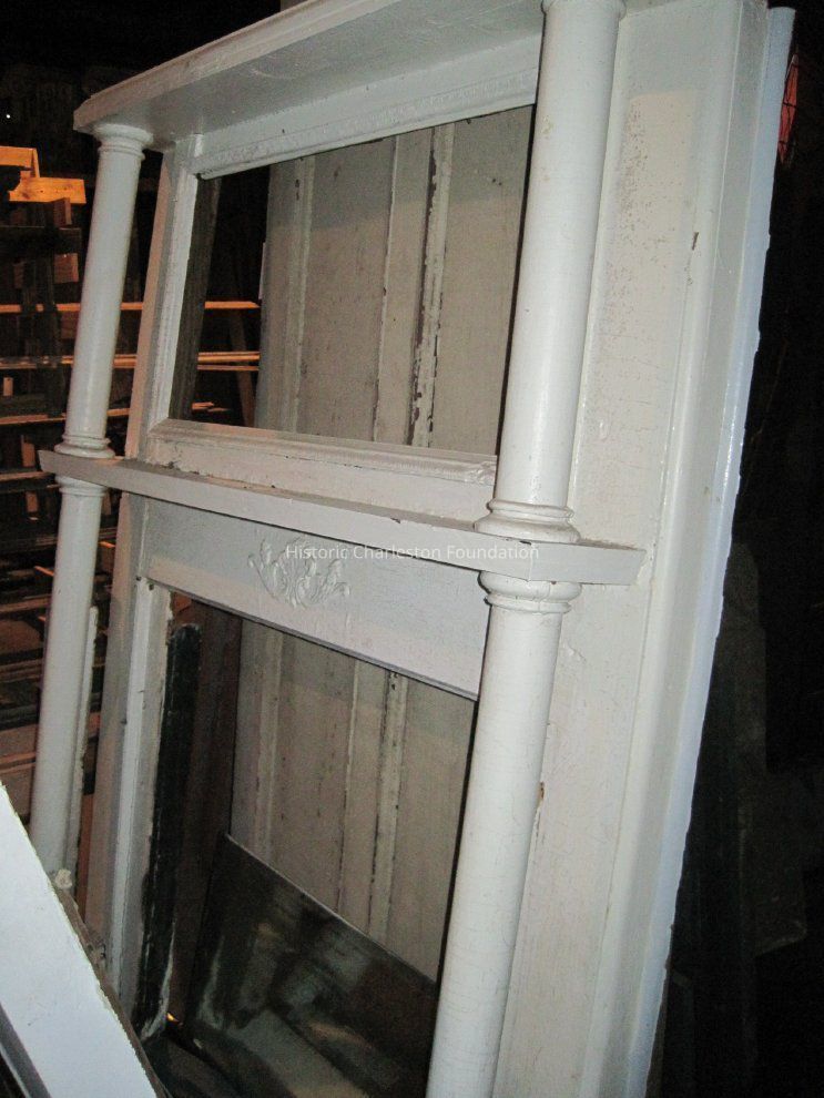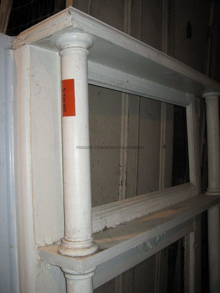 Victorian mantel with mirror. Features columns on either side of opening and compo ornament at top (see photo). Measures 75"H x 55"W. Mantel and mirror in good condition. Some pieces from the base detached during transportation to warehouse but all pieces are present. Removed from 74 Bull Street.Collection