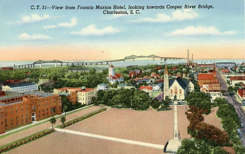Postcard of the view east from Francis Marion Hotel across the parade ground (now Marion Square) at the Old Citadel. Landmarks include Calhoun Street, the parade ground of the Old Citadel and John C. Calhoun Monument, Citadel Square Baptist Church, Second Presbyterian Church. and the Grace Memorial Bridge (old Cooper River Bridge).