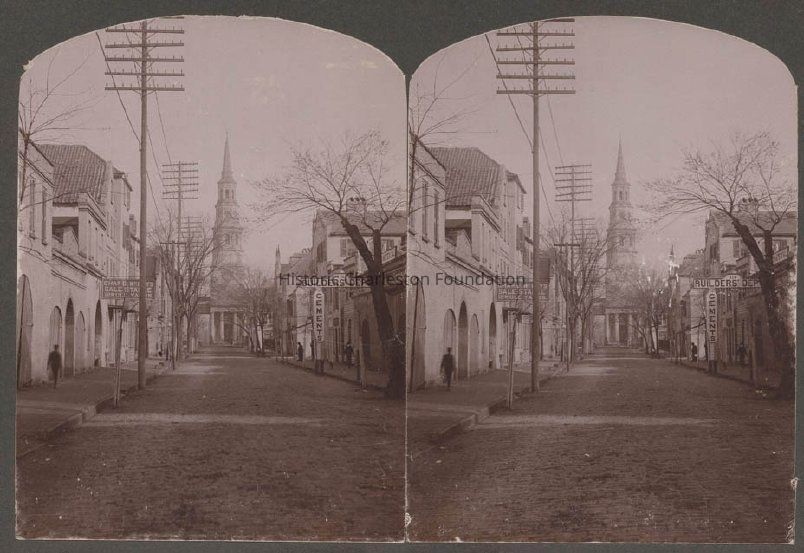 Card bearing stereographic photographs of a view north on Church Street, from Charles D. McCoy's Sale, Stable and Mule Yards (113-117 Church) at left and J.V. Brandt Builders' supplies (118 Church) at right. Signage for both businesses projects from the buildings. St. Philip's Church in background.Collection