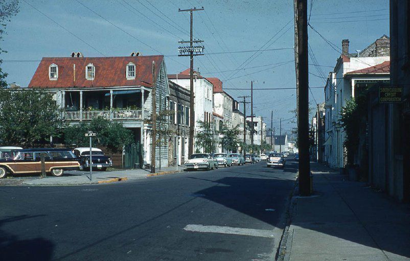 Kodachrome color slide of the view north on State Street from the corner of State and Chalmers Street. Features the west side of the street: 19 State, 23 State, 25 State, 27 State, 9 Queen (southwest corner of State and Queen), 12 Queen (northwest corner of State and Queen), and 27½ State. On the east side of the street: partial view of the South Carolina Credit Corporation (16 State?) (now a parking lot), 18 State, 20 State, 22 State, and beyond. Also shows the street corner. Cars parked along the street and on a small lot at the corner.