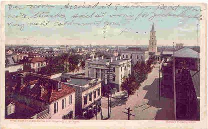 View of Charleston from the Hotel St. John, a/k/a the Mills House Hotel (115 Meeting Street). St. Michael's is in the background. Fireproof Building and the back of City Hall can be seen.Collection