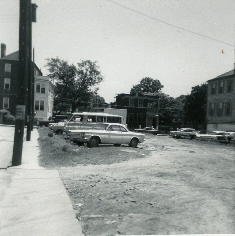 B&W photograph of a view east on George Street showing the southwest corner of George and Anson Streets. A vacant lot used for parking is in the foreground and the Anson Street houses at the original terminus of the George Street are seen in the background. The house known then as 86 Anson Street is at the left (It was later relocated to 82 Anson Street).