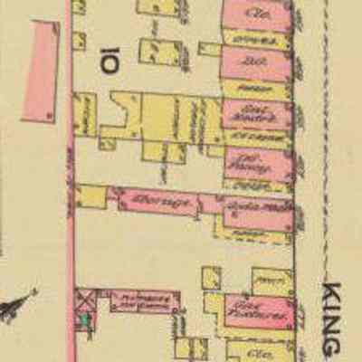 Photograph (scan) of an 1886 photograph of the grounds of the Old Citadel, now known as Marion Square, and of King Street from the corner of King and Calhoun. Shows several buildings, now lost, from ca. 387 King Street (current site of Francis Marion Hotel) to St. Matthew's Lutheran Church (405 King Street).