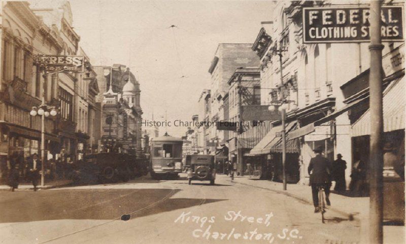 Photograph of a busy street scene on King Street, looking north from Beaufain Street from the Kress & Co. 5 and 10 Cent Store on the left (then located at 245 King) and the Federal Clothing Store (244 King). The Francis Marion Hotel can be seen in the background. Trolley car and automobiles are on the street and pedestrians are walking on the sidewalks. The five buildings at the lower right -- 244 King, 246 King, 248 King, 250 King, and 252 King Street were demolished for the construction of Charleston Place.Collection