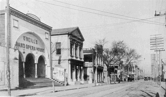 Photograph of Meeting Street looking north from O'Neill's Grand Opera House (located at what would have been 135-139 Meeting Street) and the Charleston Gas Light Co. Building (141 Meeting). Trolleys and carts in background.Context