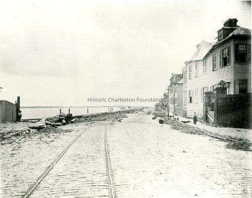 B&W photograph of the view south on East Bay Street from (probably) 39 East Bay Street, after the 1885 cyclone. Debris is in the street along The Battery. Trolley tracks on street paved with brick in foreground.Collection
