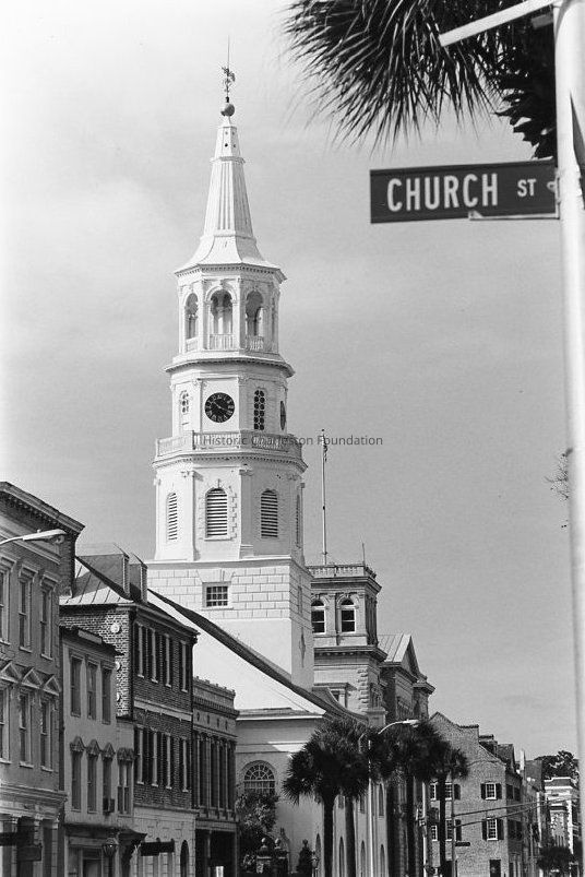 B&W photograph of Broad Street looking west from 63 Broad Street, showing 63 Broad, 65 Broad, 67-69, 71 Broad, St. Michael's Church, and beyond at left. Street sign for Church Street in foreground at right.Collection