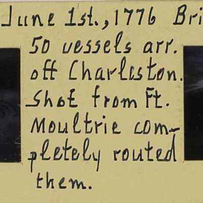 d: Captioned "On June 1st, 1776 British fleet of 50 vessels arr. off Charleston. Shot from Ft. Moultrie completely routed them."