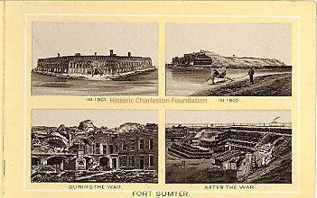 Four images of Fort Sumter over the years: in 1861 (top left), in 1965 (top right), during the war (bottom left), and after the war (bottom right).Collection