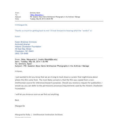 Prints are stamped Smithsonian Institution. Karen Emmons contacted the SI photo archivist (see Media tab) to inquire about the provenance of the photographs. SI archivist had no record of the photos and stated that it was likely that the film was copied from a non-SI source for reference/research purposes. Gave authority to HCF to handle any requests to reproduce.