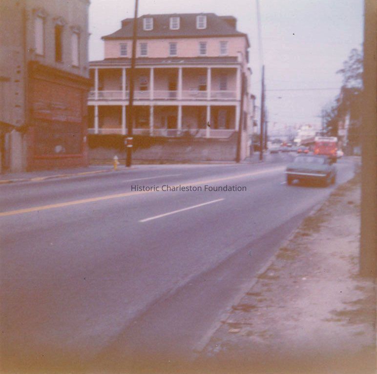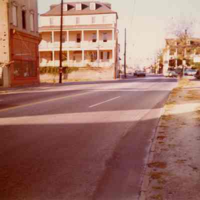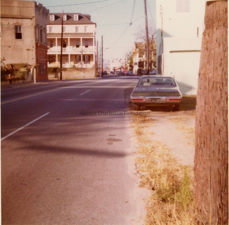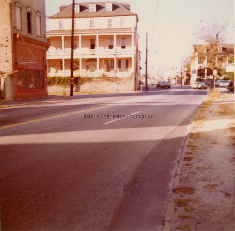a-b: View north on East Bay from the Moses Levy House (301 East Bay) to the Stephen Shrewsbury House (311 East Bay) and beyond. Also shows the north elevation of 309 East Bay, then Watson's Grocery, with its piazzas removed. Buildings on the east side of street are also in view.