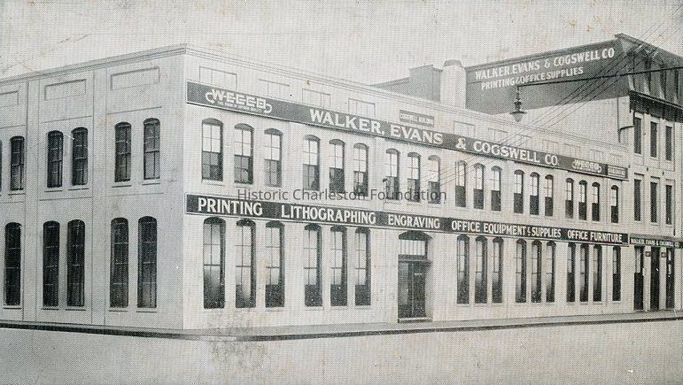 B&W photographic postcard of Printer's Row, the location of the Walker, Evans & Cogswell Co. (109-115 East Bay Street). Corner view showing the south and east (front) elevations. Also shows the street corner (East Bay and Elliott Streets). Back of postcard features an order confirmation.