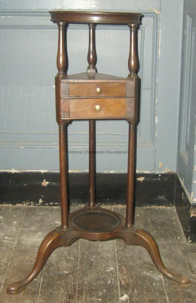 Washstand, English, 18th century, mahogany and elm having circular molded top above threee turned supports over two graduated triangular drawers with brass knob handles, over three turned supports, with circular shelf, on three cabriole legs with pad foot.Collection