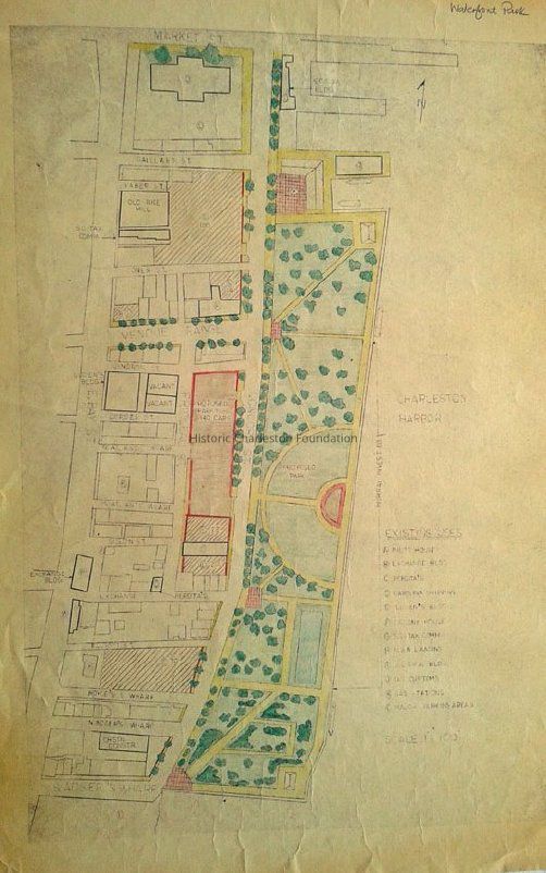 Map/landscape plan of Waterfront Park possibly created after the publication of the Charleston Waterfront Park Master Plan. Creator of original map not indicated. It has been hand-colored by Historic Charleston Foundation. Shows the area bounded by South Adger's Wharf, East Bay Street, Market Street, and the Cooper River, with building footprints.