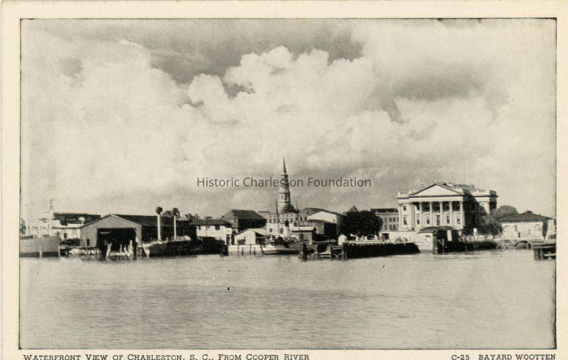 View of the Charleston waterfront from the Cooper River (B&W photographic print). Custom House and St. Michael's steeple can be seen.