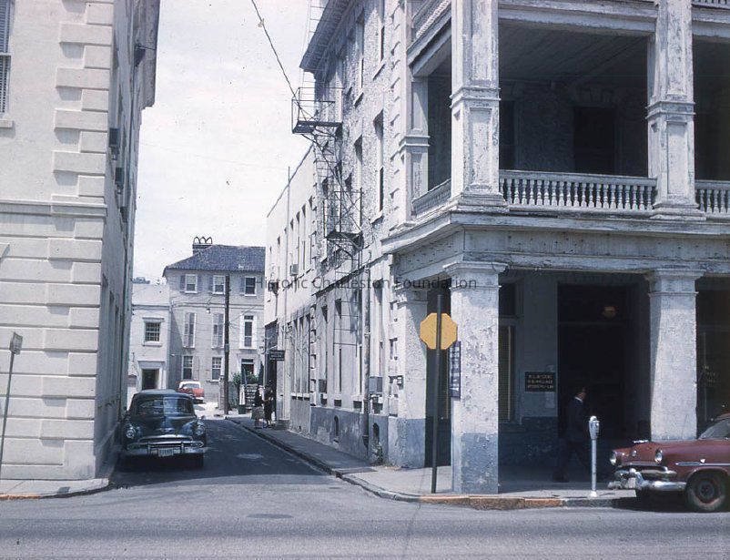Color stereoscope slide* of the view west on Courthouse Square from Meeting Street, showing the Meyer Peace House in its original location and the small two-story structure to its left. Also shows the edges of the Charleston County Courthouse (L) and Timrod Hotel (R). Car parked on Courthouse Square road; car parked on Meeting Street. Note the yellow stop sign on the corner.