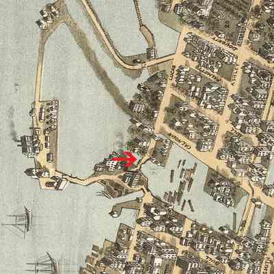 View of the West Point Mill Road. The West Point Rice Mill was located in the area of present-day 14 Lockwood Drive. In this photo, the road approaches the terminus of Calhoun Street at Lucas Street near the Ashley River. The old arsenal buildings of Porter Military Academy can be seen over the rooftops at the left, while to the right is the Jonathan Lucas House. Boys in goat-drawn carts are in the foreground, and adults and children are standing, walking, and seated along the road.Context