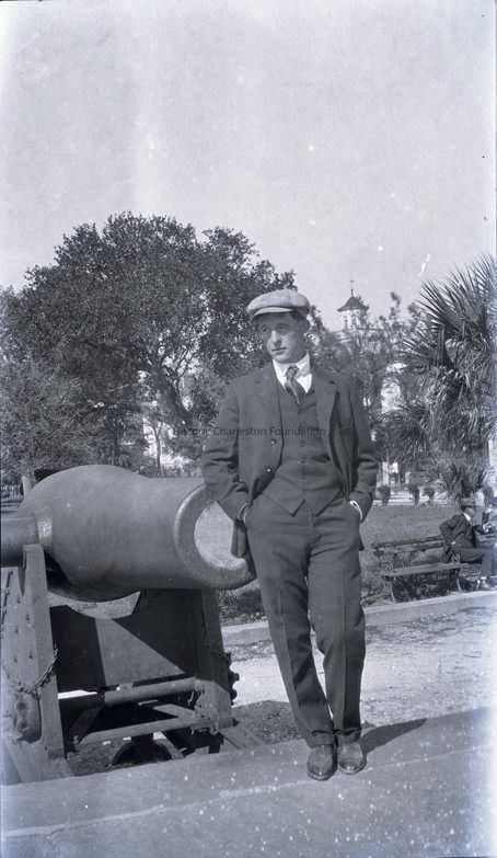 a: Man stands next to a cannon at White Point Gardens on the Battery. Cupola of the Villa Margherita can be seen in the background.