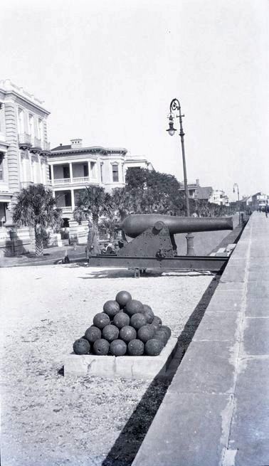 b: View looking north on East Battery from White Point Gardens (high Battery). Features a streetlight, stack of cannonballs, and a cannon in the park, and the northeast edge of the Louis DeSaussure House (1 East Battery) and south elevation of (5 East Battery).