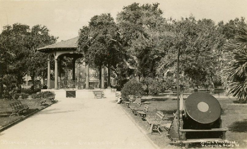Photographic postcard of White Point Garden, also known as Battery Park. Features the bandstand (gazebo), a cannon, and park benches.Collection