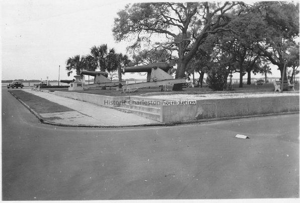 B&W photograph (scan) of the view of White Point Gardens from the corner of South Battery and East Battery. Shows cannons on East Battery side of park.Collection