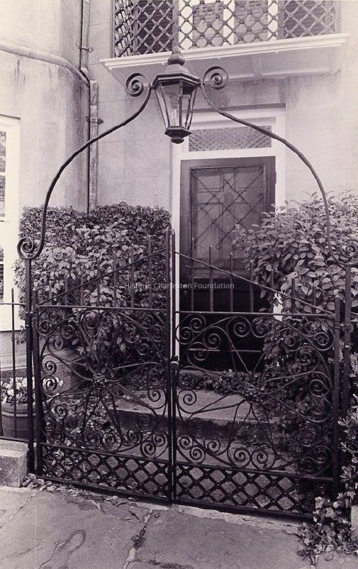 B&W photograph of the entry to the White-Williman House (25 Legare Street), fearing the wrought iron gate in the foreground.Collection