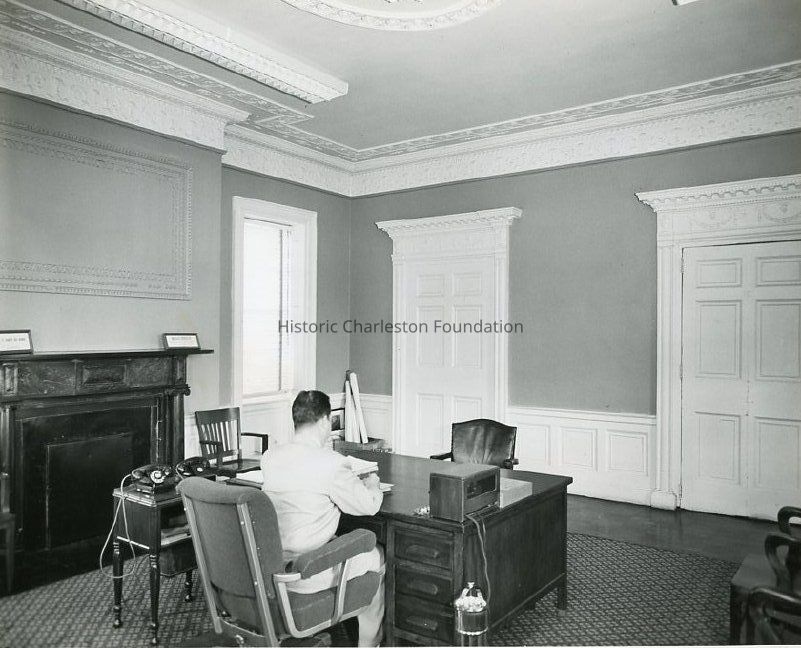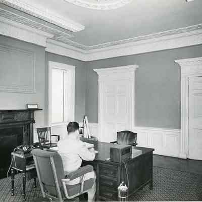 d: Office (interior) with man seated at desk. Fireplace and mantel at left. Shows the decorative door surrounds, trim, and ceiling ornamentation.