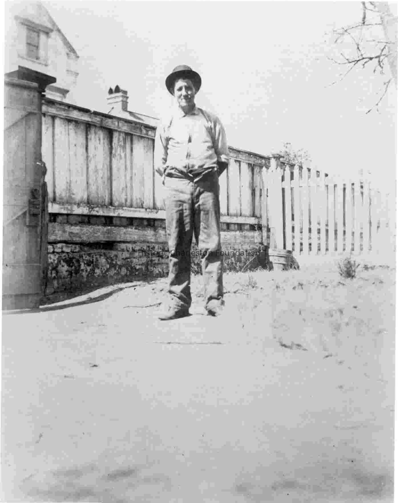 Man wearing a hat standing outside fence, dressed presumably in work (labor) clothes. Originally identified as William at the infirmary.Context
