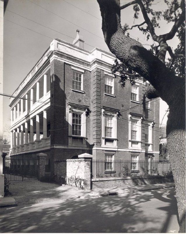 a: Corner view of the house showing the east (front) and south (piazzas) elevations. Captioned on back: "21 Legare Street, c. 1843. The builder camouflaged these particularly wide piazzas with architectural details to match the rest of the facade. Note masking windows opening on piazzas.