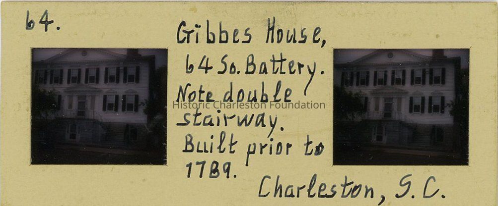 Captioned "Gibbes House, 64 So. Battery. Note double stairway. Built prior to 1789."