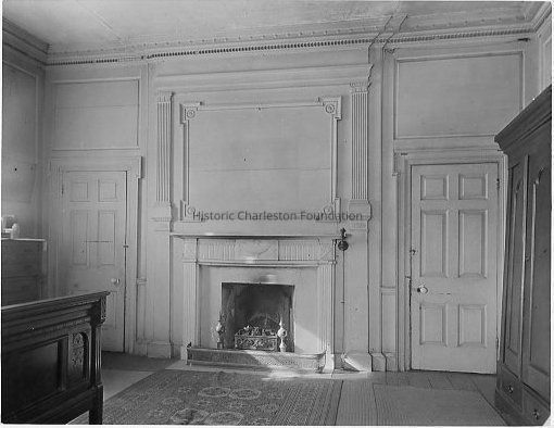 B&W photograph of the east wall of the second floor southwest room of the William Gibbes House [64 South Battery]. Features fireplace, mantel, doors, and cornice.Photograph Details