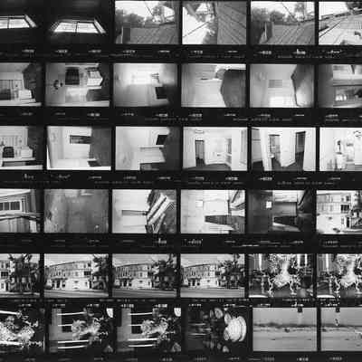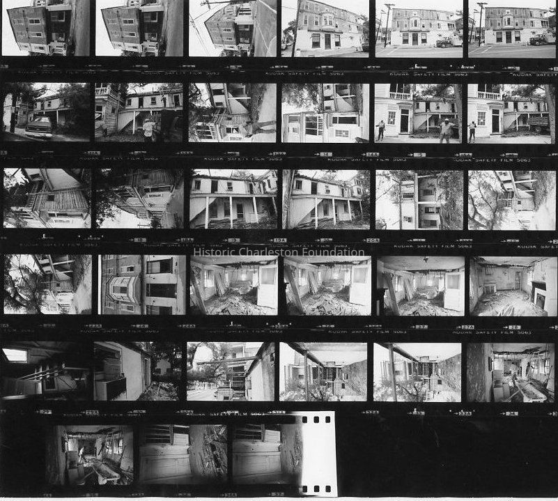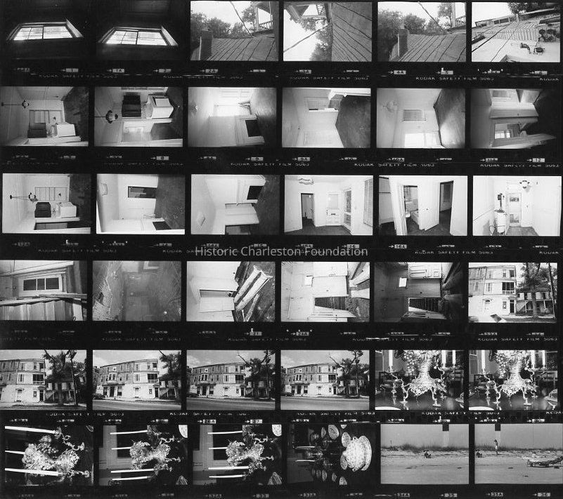 Two contact sheets, each showing 36 B&W photographs of the William Harvey House (58 Meeting Street), a/k/a Pete's Grocery, during restoration. Exterior and interior views.