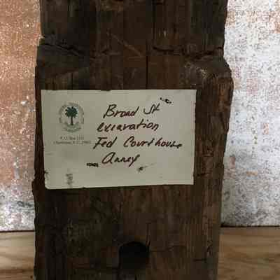 Wood post from the excavation site of the Federal Courthouse Annex on Broad Street. Top is damage; bottom has some shape.Collection