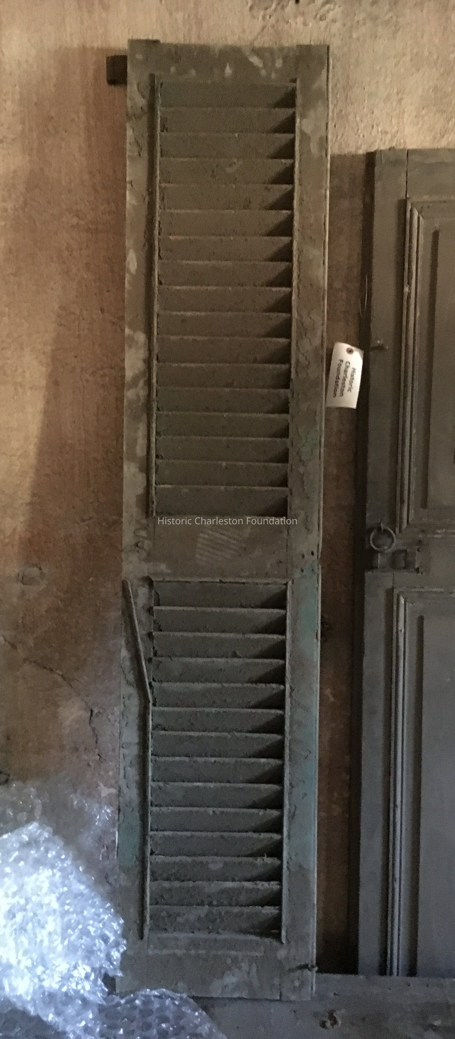 Single wood shutter. Some trim damaged; paint mostly gone.Collection