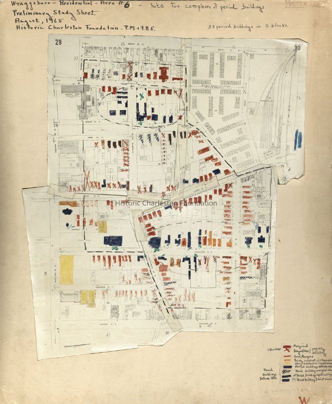 Copy of a Sanborn Map hand-colored and annotated for use by Historic Charleston Foundation to study a residential area in Wraggborough.