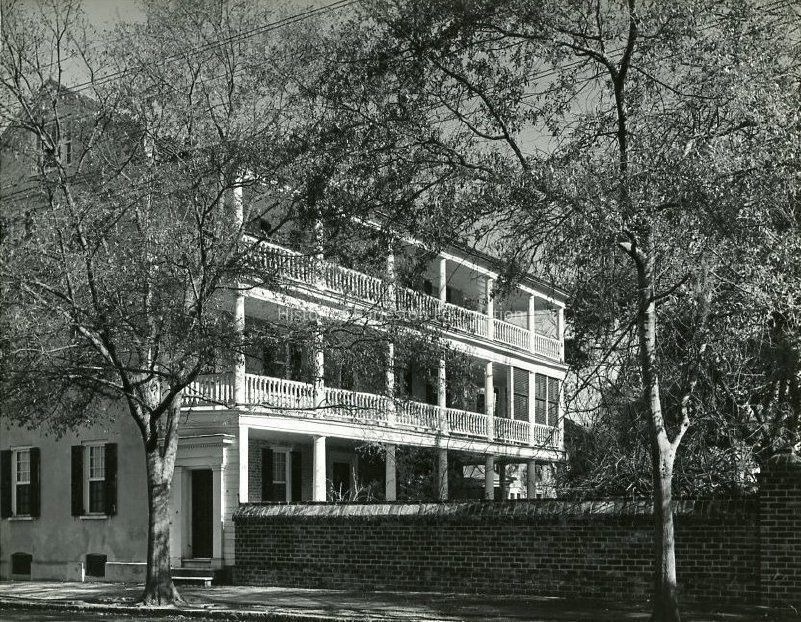 B&W photograph of the Young-Motte House (30 Meeting Street), corner view showing the west (front) and south (piazzas) elevations, partially obstructed by trees.